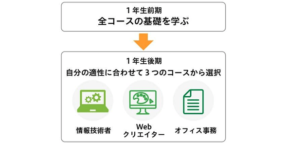 ITビジネス学科では1年生の後期からコース選択をすることができるので、自分のやりたいことや自己適性を半年間しっかりと見極めてから専門分野を学ぶことができます。
