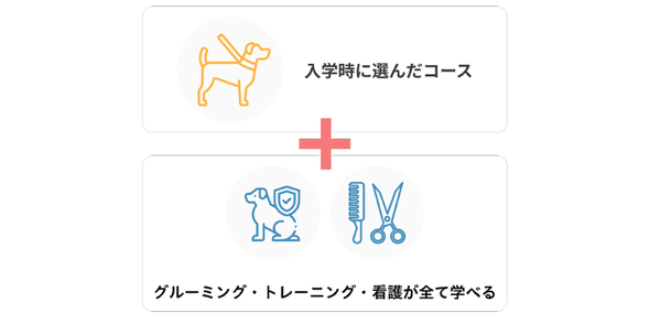 専攻するコースをメインに、“ペットのプロ“をめざして、グルーミング・トレーニング・看護の基礎をマスターするカリキュラム!