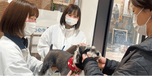 サロンワーク実習!飼い主さまへの接客対応などを通じて、実際の現場で必要なコミュニケーション力・マナーなどの社会人スキルを養います。学んだスキル&センスを実践でさらに高める!