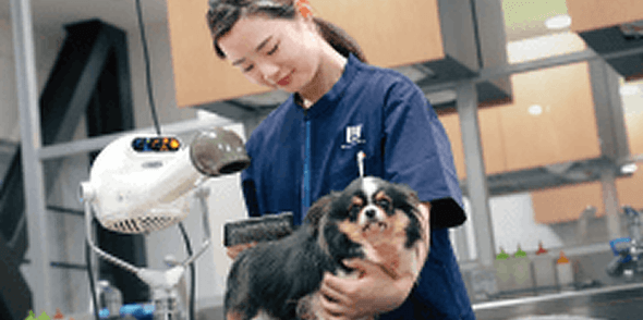 多種多様な犬や猫のトリミング実習を通じて、あらゆるお手入れ技術を習得。技術と感性の両面から、